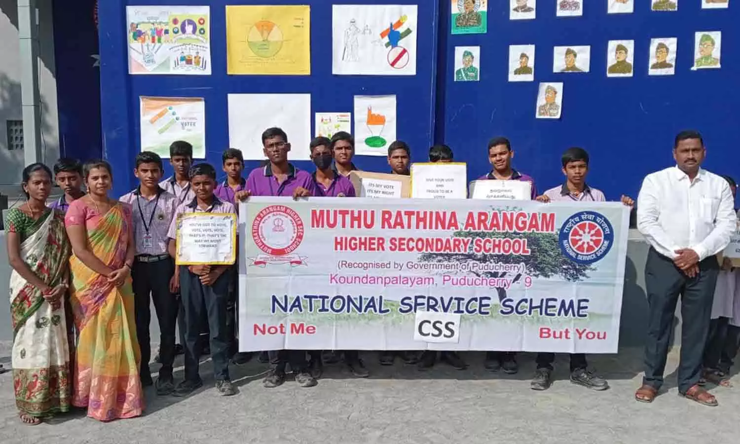 புதுவை கவுண்டன்பா ளையம் முத்துரத்தினம் அரங்கம் மேல்நிலைப் பள்ளியில் தேசிய வாக்காளர் தினத்தை முன்னிட்டு நாட்டு நல பணித்திட்டம் மற்றும் சமுதாய நலப்பணி திட்டம் மாணவர்கள் இணைந்து 100 சதவீதம் வாக்களிப்போம் என்பதை வலியுறுத்தி விழிப்புணர்வு பேரணி நிகழ்ச்சி நடைபெற்றது.