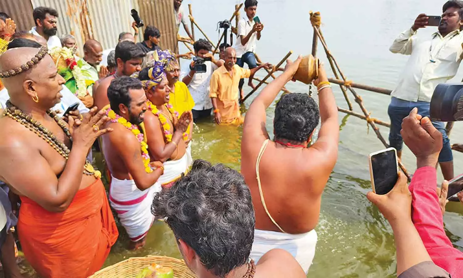 செங்கோல் ஆதீனம் 103-வது குரு மகா சன்னிதானம் ஸ்ரீலஸ்ரீ சிவப்பிரகாச சத்யஞான தேசிய பராமாச்சாரிய சுவாமிகள், மயிலம் பொம்மபுர ஆதீனம் 20-ம் பட்டம் ஸ்ரீலஸ்ரீ சிவஞான பாலய சுவாமிகள், காரைக்கால் ஸ்ரீமத் ஸ்ரீகண்ட வித்யாபீட ஸ்தாபகர் பாலசர்வேஸ்வர சிவாச்சாரியார், எழிலன் மற்றும் சிவனடியார்கள் புனித நீராடலை தொடங்கி வைத்தனர்.