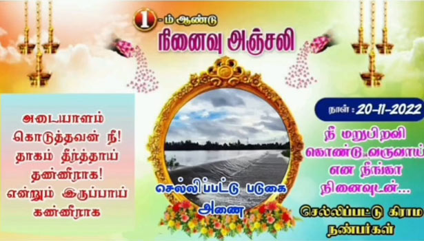 இதையடுத்து அப்பகுதி இளைஞர்கள் செல்லிப்பட்டு படுகை அணைக்கு முதலாம் ஆண்டு நினைவஞ்சலி என போஸ்டர் தயாரித்து சமூகவலைதளங்களில் வெளியிட்டுள்ளனர்.