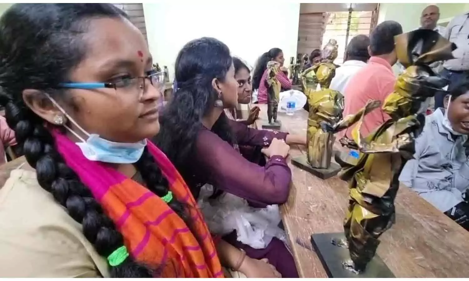 பொம்மை செய்ய மாணவர்கள் பயிற்சி பெறும் காட்சி.