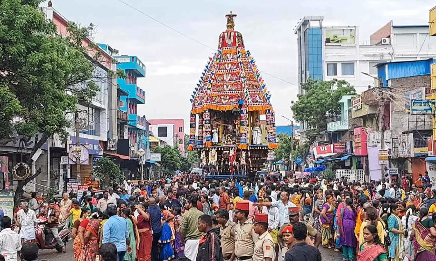 தொடர்ந்து பக்தர்களுக்கு அன்னதானம் வழங்கப்பட்டது. தேர் வீதியுலா வரும் போது வடக்கு வீதி வந்த போது அங்குள்ள தனியார் பள்ளியில் தமிழ்த்தாய் வாழ்த்து மாணவர்களால் பாடப்பட்டது.