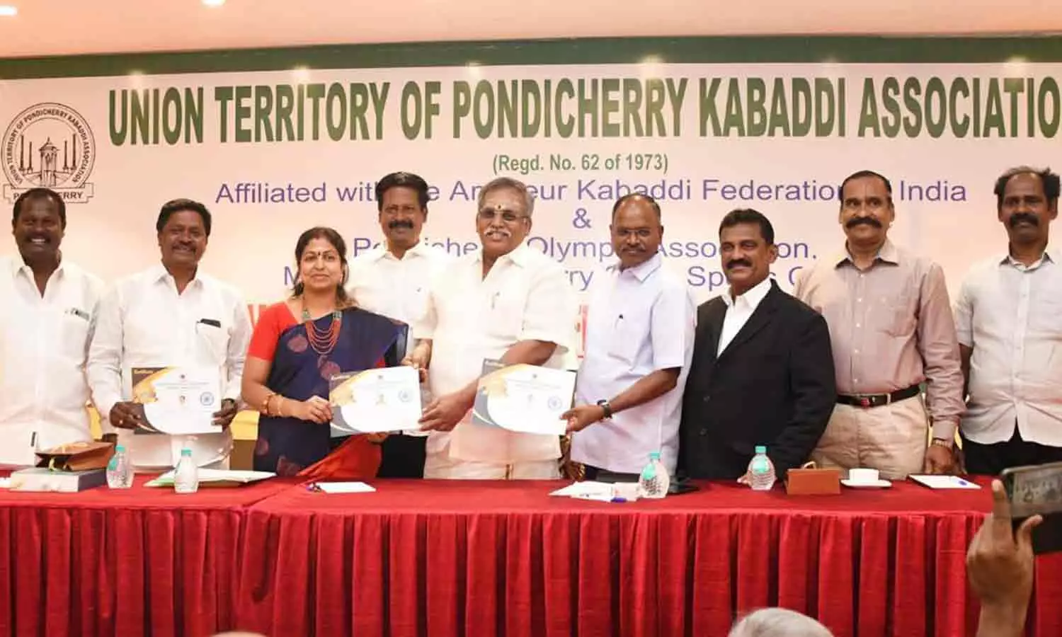 புதுவை மாநில கபடி சங்க புதிய தலைவராக தேர்வு செய்யப்பட்ட விஜயராணி ஜெயராமன் உள்ளிட்ட நிர்வாகிகளுக்கு சபாநாயகர் ஏம்பலம் செல்வம் சான்றிதழ் வழங்கிய காட்சி.