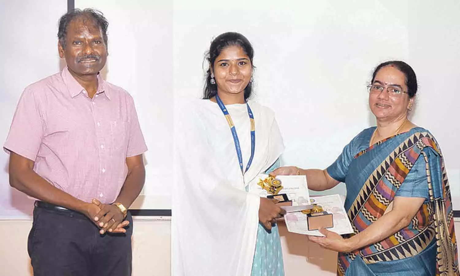 சாரதாகங்காதரன் கல்லூரியில் நடந்த மகளிர் தினவிழாவில் பங்கேற்ற மாணவிக்கு பரிசு வழங்கப்பட்ட காட்சி.