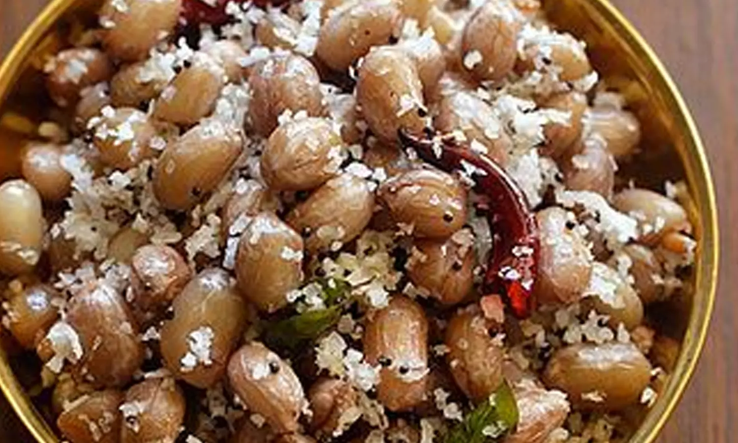 இப்போது வேகவைத்த நிலக்கடலை, உப்பு சேர்த்து நன்கு கிளறி, தேங்காய் துருவல் சேர்த்து ஓரிரு நிமிடங்கள் கிளறி இறக்கவும்.