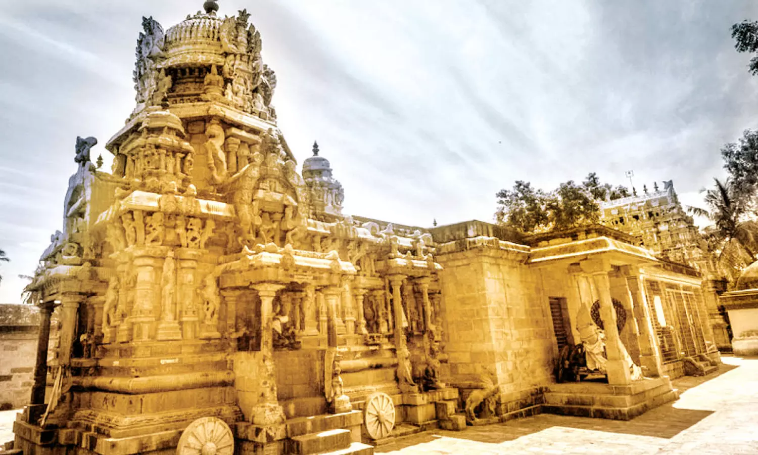 கருவறை மற்றும் அர்த்தமண்டபத்தின் புறச்சுவர்களில் எண்ணிலடங்கா சிற்பங்கள் செதுக்கப்பட்டுள்ளன. கருவறையைச் சுற்றி ஐந்து தேவகோட்டங்கள் அமைக்கப்பட்டுள்ளன. தெற்கில் அர்த்தநாரீசுவரரும், தட்சிணாமூர்த்தியும், மேற்கில் திருமாலும், வடக்கில் நான்முகனும், ஆலிங்கனமூர்த்தியும், மகிஷாசுரனின் தலைமீது நின்ற கோலத்தில் துர்க்கையும் இக்கோட்டங்களில் அருள்பாலிக்கின்றனர்.