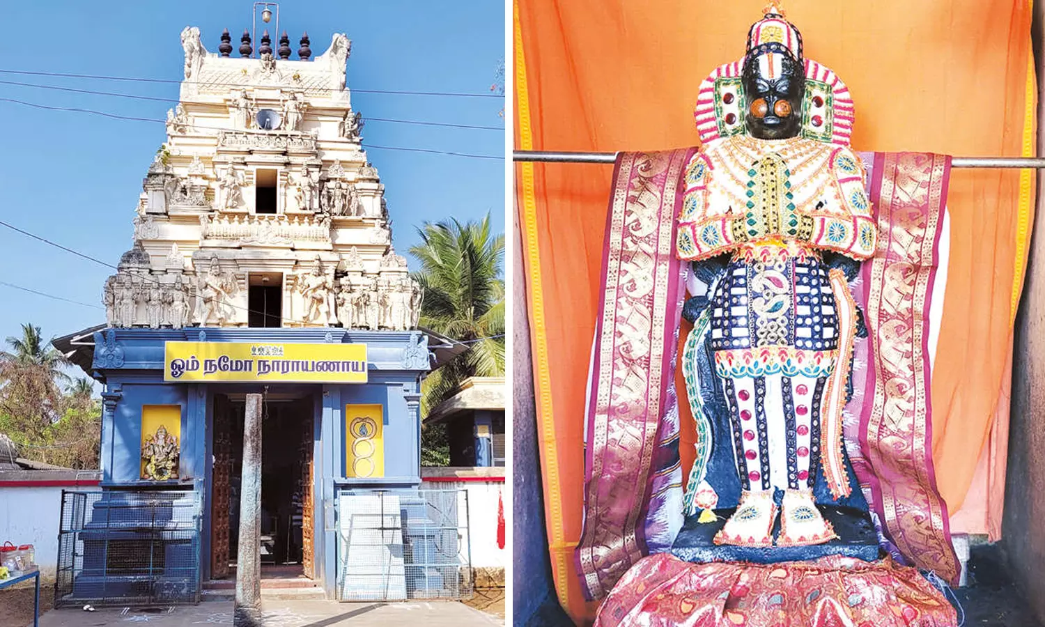 அவர்களை வணங்கி உள்ளே நுழைந்ததும், ராஜகோபுரத்தின் உட்புறத்தில் ஒரு புறம் சுதர்சனப் பெருமாளும், மற்றொருபுறம் நரசிம்மரும் பிரமாண்டமான சுதைச் சிற்ப வடிவத்தில் காட்சி தந்து மெய்சிலிர்க்க வைக்கிறார்கள். சக்கரத்தாழ்வாரை வணங்கி உள்ளே நுழைந்ததும், பலிபீடமும், கருடாழ்வார் சன்னிதியும் இருக்கிறது.