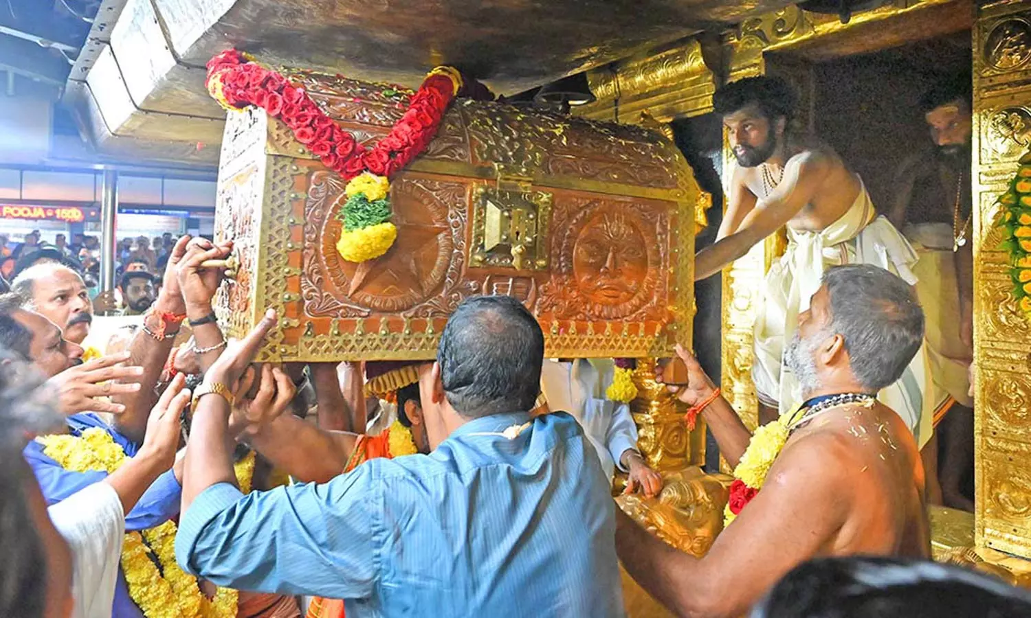 ஐயப்பனுக்கு அணிவிப்பதற்காக சன்னிதானத்துக்கு கொண்டுவரப்பட்ட தங்க அங்கியை கோவில் தந்திரி கண்டரரு மகேஷ் மோகனரு பெற்றுக்கொண்ட காட்சி.
