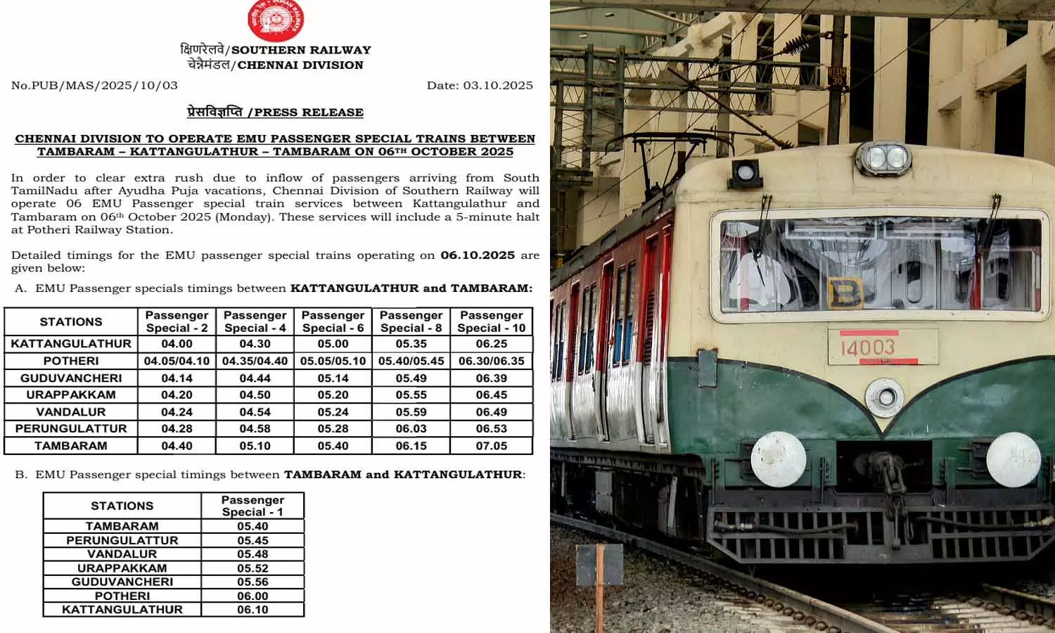 ஆயுத பூஜை விடுமுறை முடிந்து சொந்த ஊர்களில் இருந்து சென்னை திரும்பும் பயணிகள் வசதிக்காக அக்.6-ம் தேதி அதிகாலையில் காட்டாங்குளத்தூர் முதல் தாம்பரத்திற்கு மின்சார ரெயில் சிறப்பு சேவைகள் இயக்கப்படும் என தெற்கு ரெயில்வே அறிவித்துள்ளது.