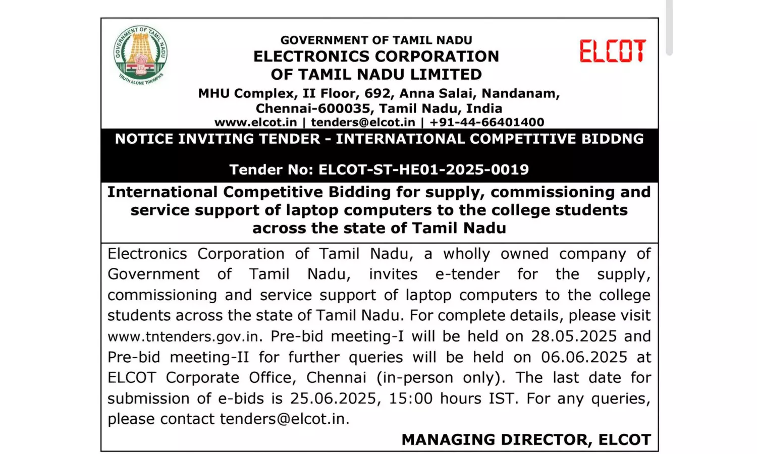 2025-2026-ம் ஆண்டிற்கான பட்ஜெட் அறிவிப்பில் கல்லூரி மாணவர்களுக்கு மடிக்கணினி வழங்கும் திட்டம் செயல்படுத்தப்படும் என அறிவிக்கப்பட்டது. இதை செயல்படுத்தும் வகையில் 20 லட்சம் மடிக்கணினிகளை கொள்முதல் செய்ய சர்வதேச டெண்டர் கோரியது எல்காட் நிறுவனம். 8 ஜி.பி. ரேம், 256 ஜி.பி.எஸ்.எஸ்.டி. கொண்ட ஹார்ட் டிஸ்க், 14 அல்லது 15.6 இஞ்ச் திரை ஆகிய செயல் திறன் கொண்ட வகையில் இந்த மடிக் கணினி இருக்க வேண்டும் என அதில் குறிப்பிடப்பட்டுள்ளது.