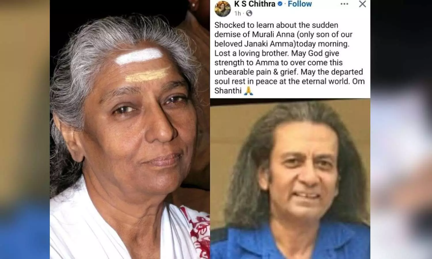 "இன்று காலை எங்கள் அன்புக்குரிய ஜானகி அம்மாவின் ஒரே மகன் முரளி அண்ணாவின் திடீர் மறைவுச் செய்தியைக் கேட்டு நான் அதிர்ச்சியடைந்தேன். நாங்கள் ஒரு அன்பான சகோதரனை இழந்துவிட்டோம். இந்த தாங்க முடியாத வலியையும் துக்கத்தையும் கடக்கும் வலிமையை அம்மாவுக்கு கடவுள் வழங்கட்டும். மறைந்த ஆன்மா நித்திய சாந்தியில் இளைப்பாறட்டும். ஓம் சாந்தி" என்று கே.எஸ். சித்ரா அந்தப் பதிவில் குறிப்பிட்டுள்ளார்.