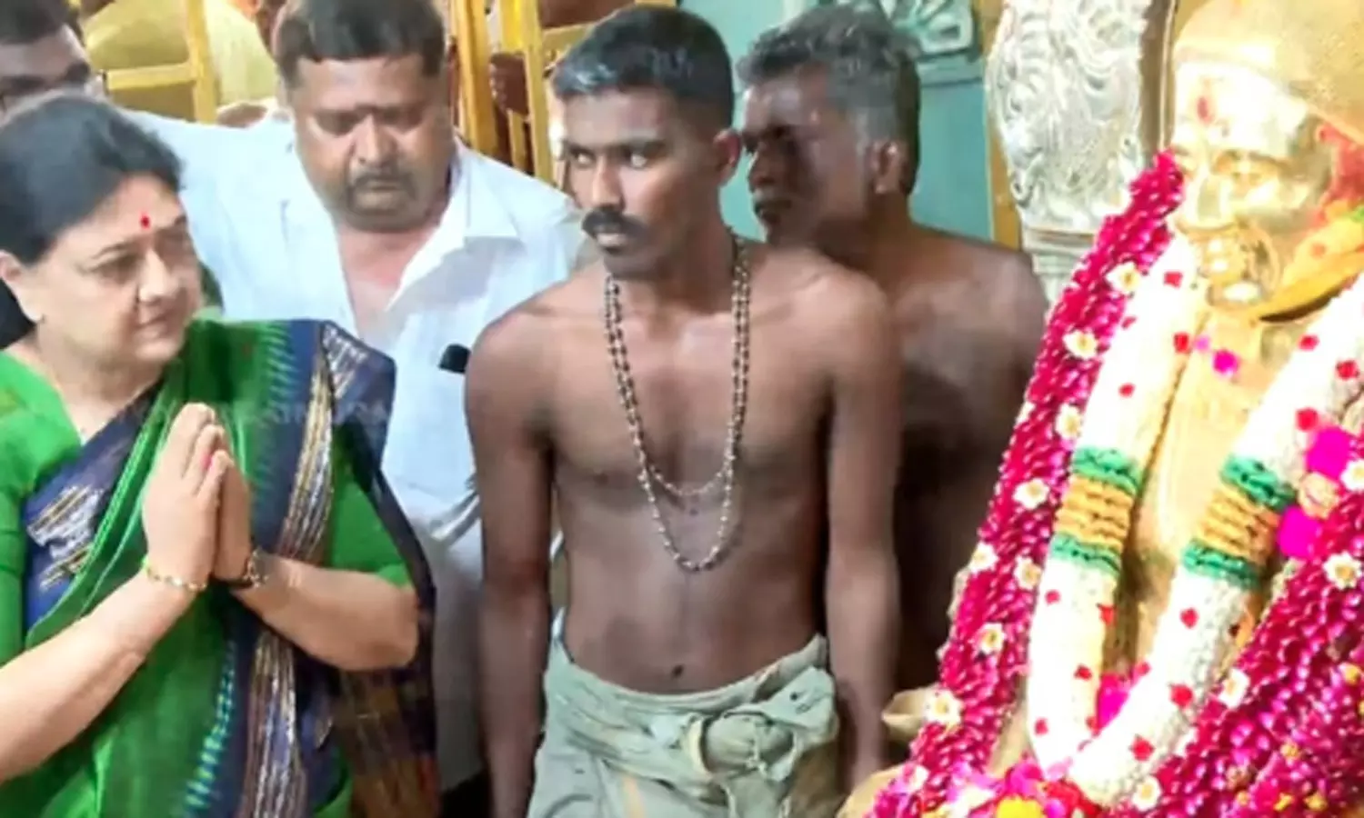 பின்னர் பசும்பொன் முத்துராமலிங்கத்தேவர் நினைவிடத்தில் மாலை அணிவித்து மரியாதை செலுத்திய வி.கே.சசிகலா தரையில் அமர்ந்து வழிபாடு செய்தார்.
