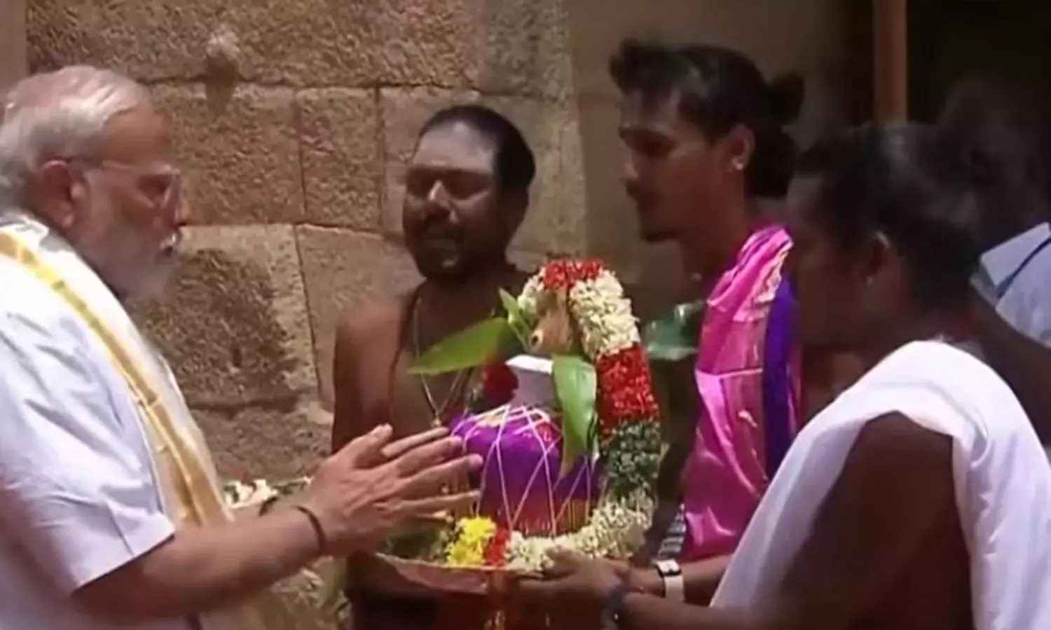 விழாவின் நிறைவு நாள் நிகழ்ச்சியில் (ஜூலை மாதம் 27-ந்தேதி) பங்கேற்பதற்காக பிரதமர் மோடி திருச்சியிலிருந்து ராணுவ ஹெலிகாப்டர் மூலம் கங்கைகொண்ட சோழபுரம் வந்தார். அவர், தமிழரின் பாரம்பரிய உடையான வேட்டி, சட்டை, துண்டு அணிந்து வந்தார்.