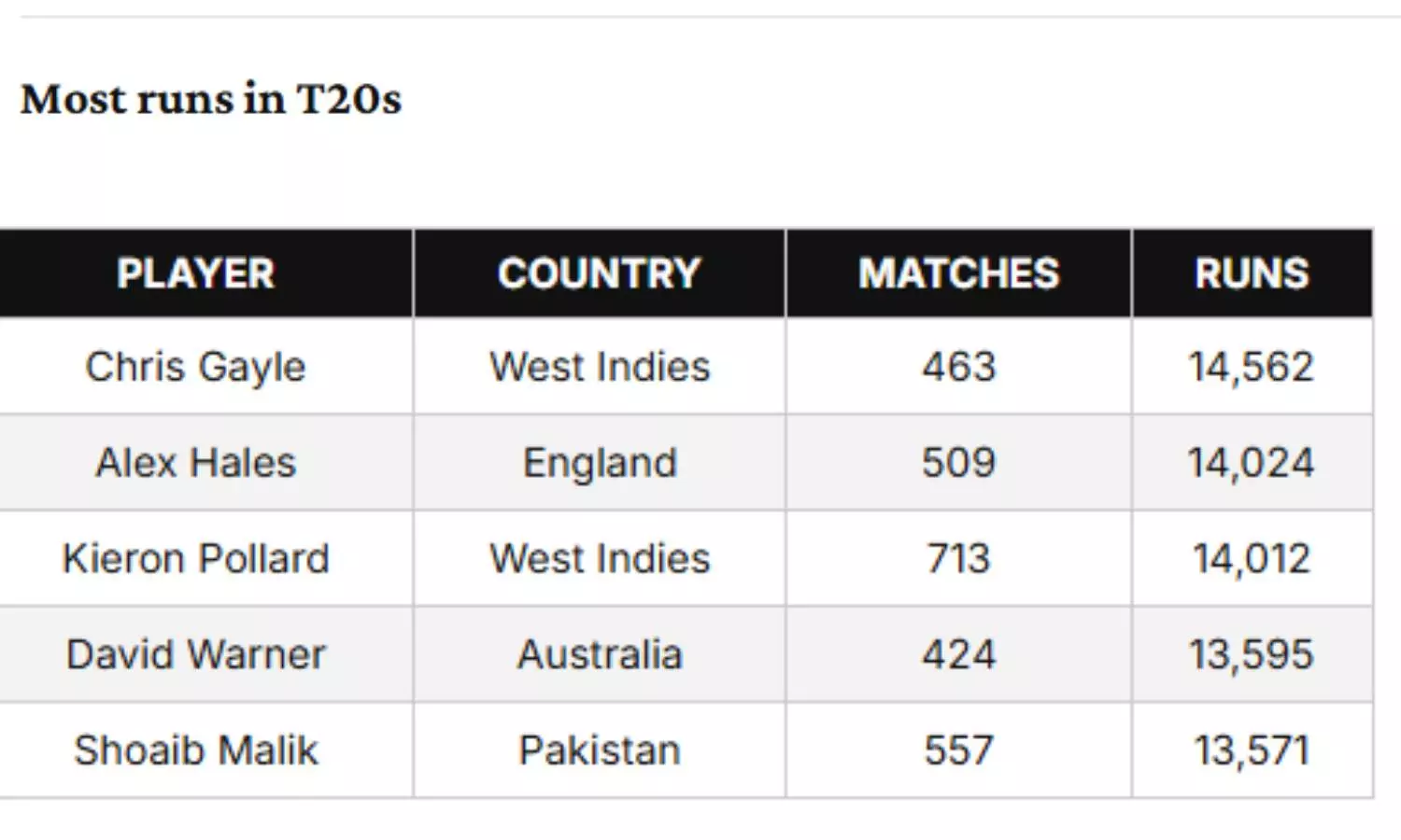 டி20 போட்டிகளில் அதிக ரன்கள் குவித்தவர்கள் பட்டியலில் 14,562 ரன்களுடன் கெய்ல் முதலிடத்தில் உள்ளார்.