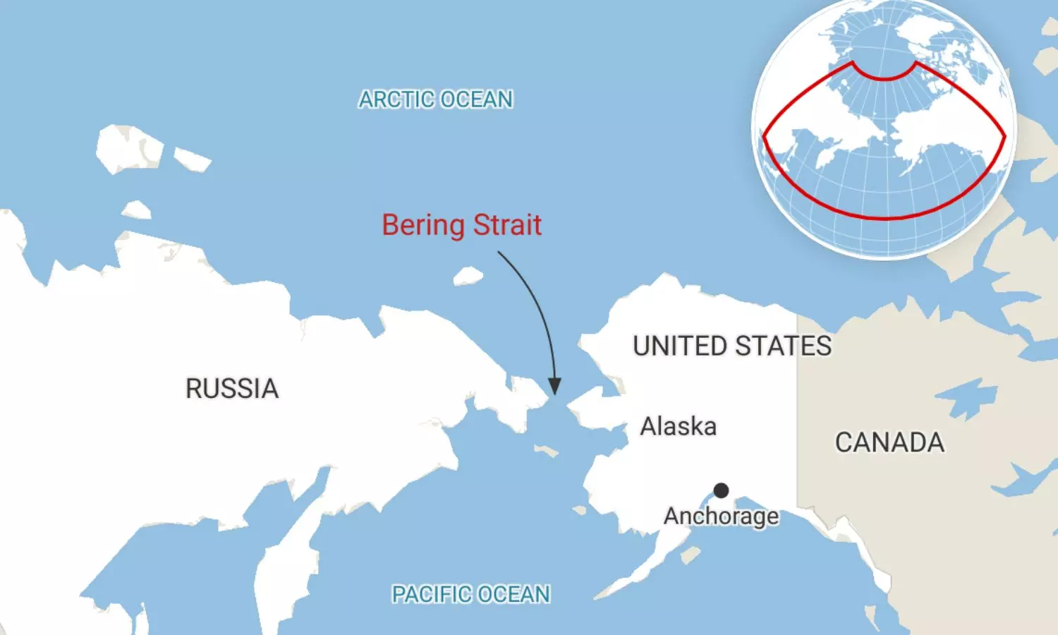 ரஷியாவுக்கும் அமேரிக்காவின் அலாஸ்காவுக்கும் இடையே பேரிங் ஜலசந்தி அமைந்துள்ளது.