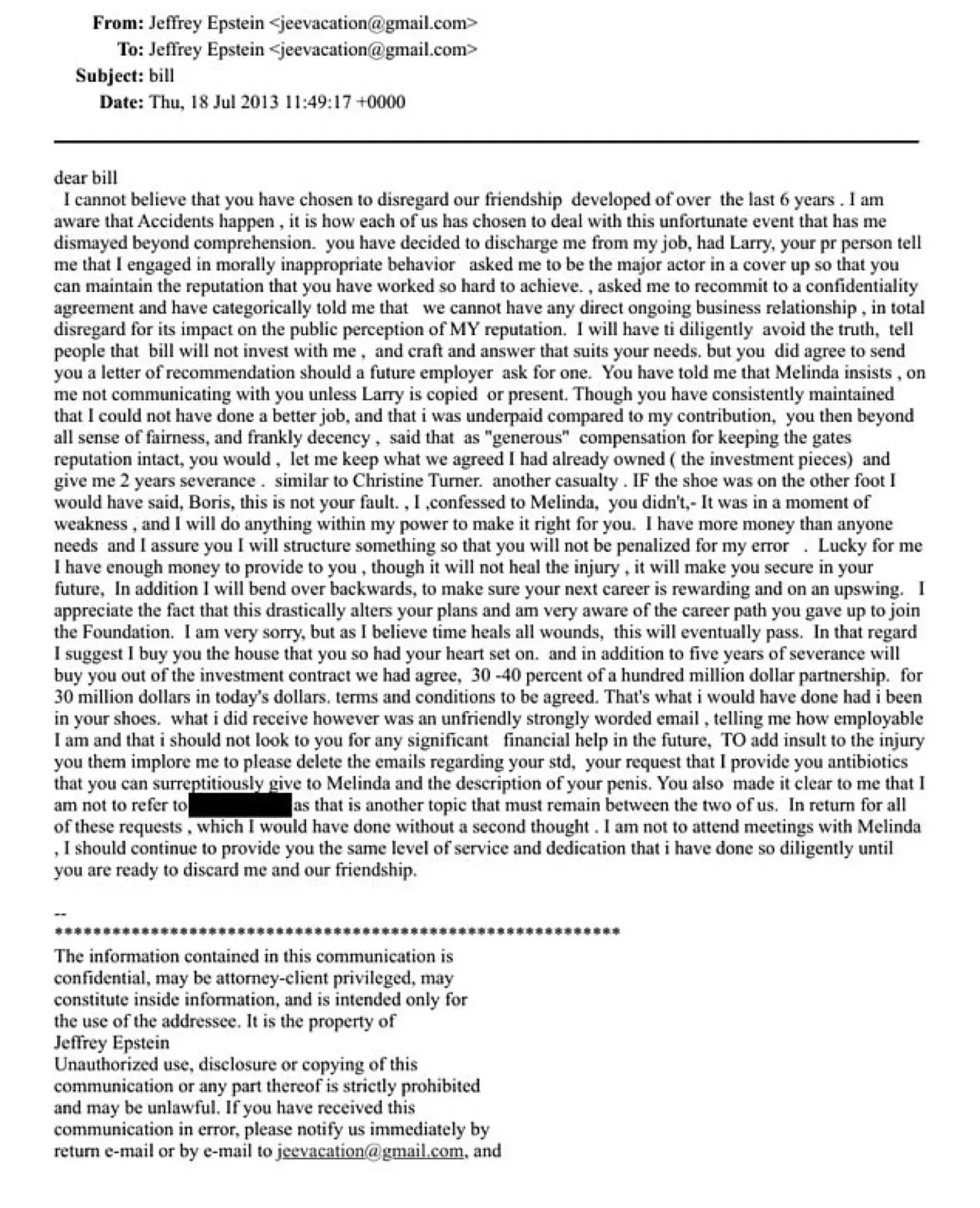 2013-இல் எப்ஸ்டீன் தனக்குத்தானே அனுப்பிக்கொண்ட மின்னஞ்சல்களில் பில் கேட்ஸ் குறித்து இத்தகைய தகவல்களைக் குறிப்பிட்டுள்ளார்.
