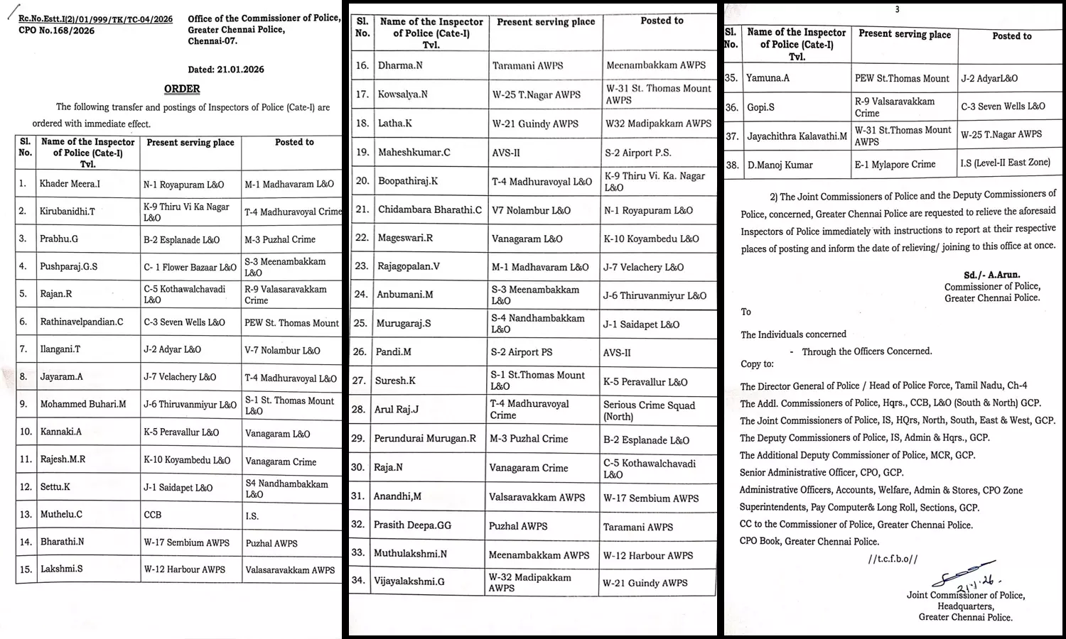 பெருநகர சென்னை காவல்துறையில் நிர்வாக நலன் கருதி, ஒரே நேரத்தில் 38 காவல் ஆய்வாளர்களை இடமாற்றம் செய்து சென்னை மாநகர காவல் ஆணையர் உத்தரவிட்டுள்ளார்.