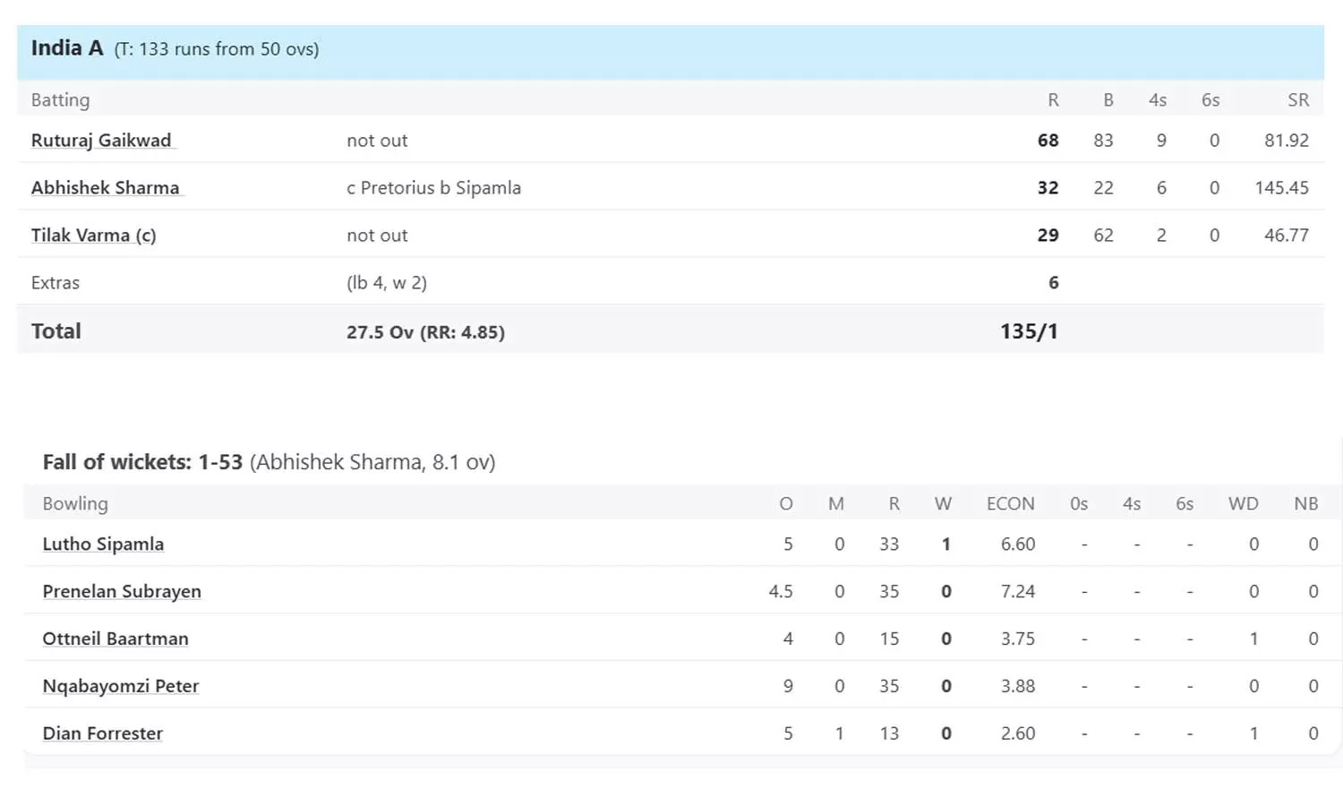 பின்னர் 133 ரன்கள் அடித்தால் வெற்றி என்ற இலக்குடன் இந்தியா 'ஏ' அணி களம் இறங்கியது. அபிஷேக் சர்மா 22 பந்தில் 32 ரன்கள் எடுத்து ஆட்டமிழந்தார். ருதுராஜ் கெய்க்வாட் ஆட்டமிழக்காமல் 68 ரன்கள் அடிக்க இந்தியா 'ஏ' 27.5 ஓவரிலேயே 135 ரன்கள் எடுத்து 9 விக்கெட் வித்தியாசத்தில் அபார வெற்றி பெற்றது.