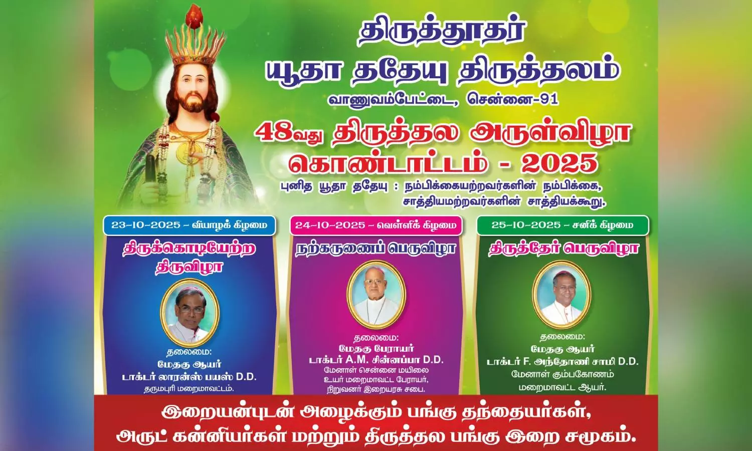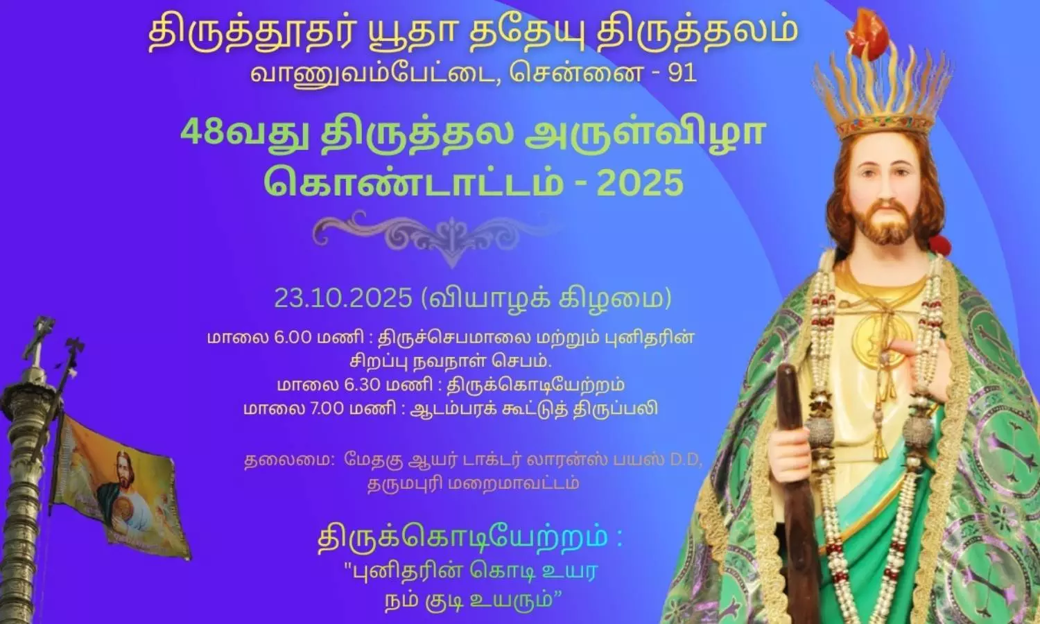 சென்னை வாணுவம்பேட்டையில் உள்ள புனித யூதா ததேயு திருத்தலத்தின் 48-வது ஆண்டு விழா கொடியேற்றத்துடன் இன்று (வியாழக்கிழமை) தொடங்குகிறது.