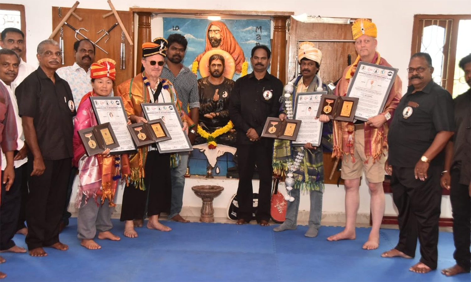பின்னர் இவர்கள் 4 பேரையும் சர்வதேச மஞ்சூரியா குங்ஃபூ தற்காப்புக் கலையகம், மாமல்லபுரம் வரவழைத்து அவர்களுக்கு "போதிதர்மர்" வாழ்நாள் சாதனையாளர் என்ற விருதை வழங்கி கௌரவித்தது. அப்போது விழா அரங்கத்தில் இருந்த சிலம்பம் கம்புகளை எடுத்து, அமெரிக்க நாட்டு தற்காப்புக்கலை வீரரும், சுவிட்சர்லாந்து வீரரும் முறையாக தத்ரூபமாக சிலம்பம் சுற்றி சண்டையிட்டனர்.