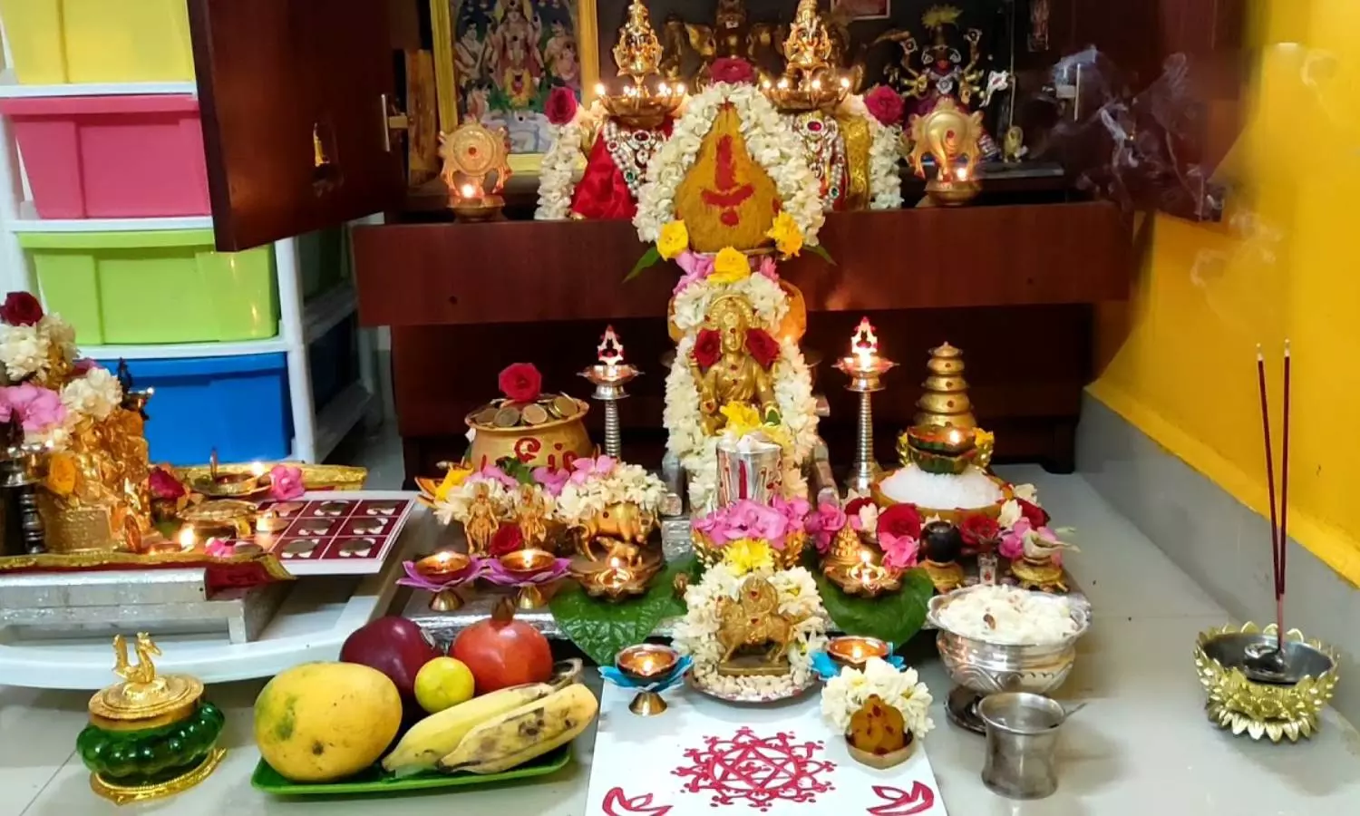 இதற்கு முன் கோலம் போட்டு நுனி வாழை இலையில் அரிசியைப் பரப்பி, அதன் மீது விளக்கு ஏற்றி வைக்கவும். பின்னர் மஞ்சள் பிள்ளையார் பிடித்துக் குங்குமம் இட்டு பூ போடவும். பொன், பொருள், புத்தாடைகள் வாங்கி இருந்தால் கலசத்திற்கு அருகில் வைக்கவும். அர்ச்சனைகள் முடிந்த பிறகு தூபம், தீபம் காட்டி, பால் பாயாசம் நைவேத்யம் செய்யலாம்.