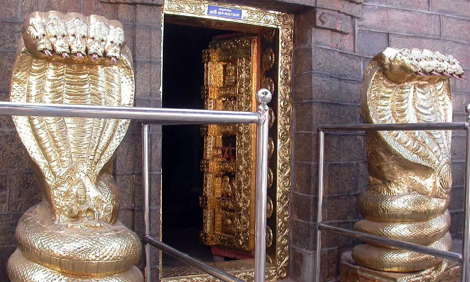 நாகராஜர் கோவிலின் உட்கோவில் வாசலில் இருபக்கமும் ஐந்து தலையுடன் படமெடுத்த கோலத்தில் ஆறு அடி உயரத்தில் இரண்டு பெரிய பாம்பு சிலைகள் கிழக்கு நோக்கி காட்சி தருகின்றன. அவற்றுள் தெற்கே அமைந்துள்ள பாம்பின் படத்தின் அடியில் சுற்றி வளையம் போல அமைந்த அதன் உடற்பகுதியின் மேல் ஆழ்ந்த சிந்தையில் அமர்ந்துள்ள ஓர் உருவம் உள்ளது.