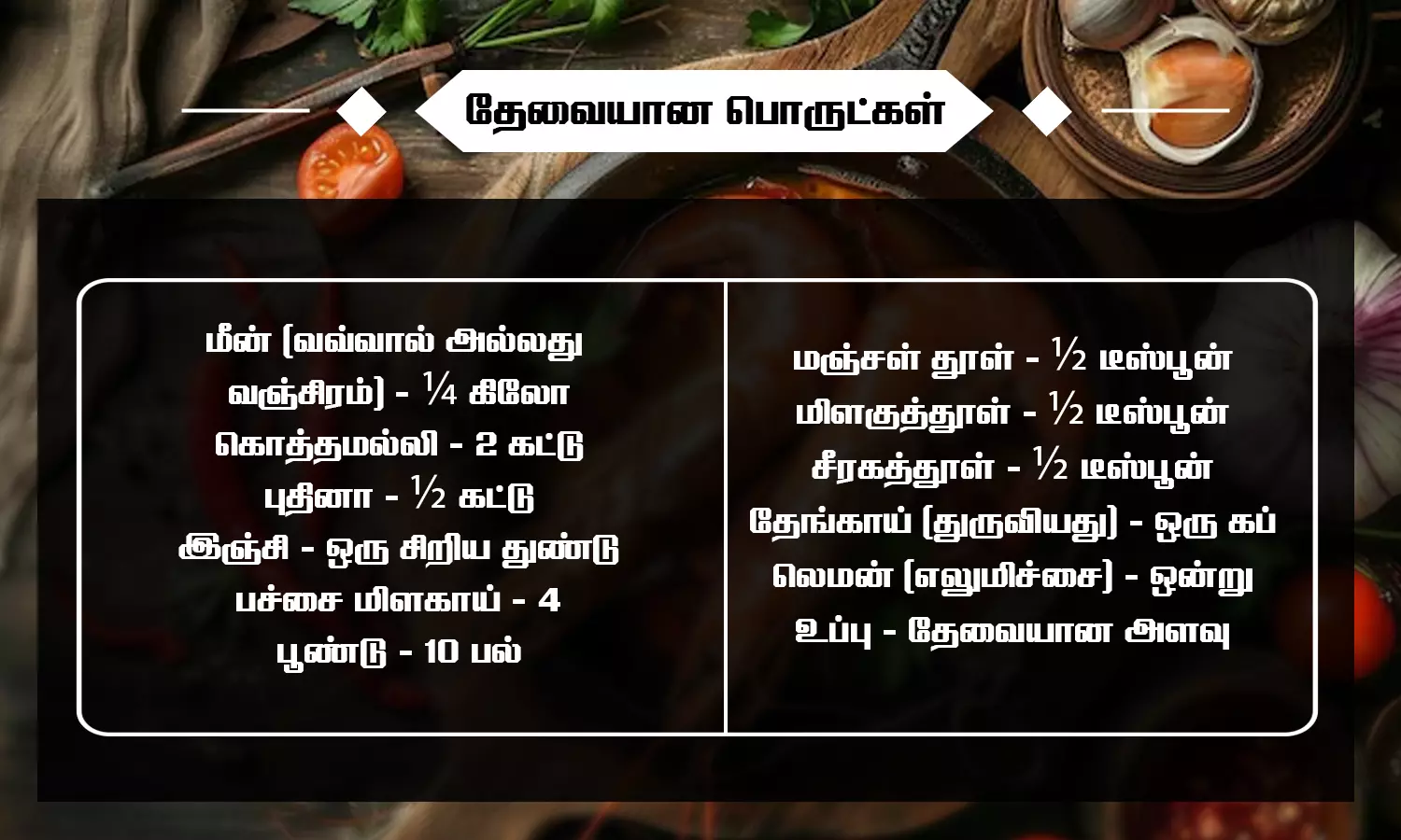 * இந்தக் காரசாரமான மசாலாவை, ஏற்கனவே உப்பு மற்றும் லெமன் சேர்த்து ஊற வைத்துள்ள மீன் துண்டுகளுடன் நன்கு கலக்கவும்.