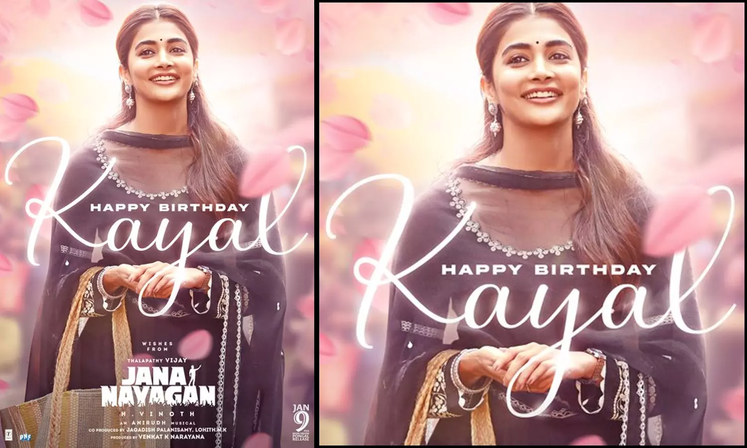 அதன்படி, 'ஜனநாயகன்' படத்தில் கயல் என்ற கதாபாத்திரத்தில் பூஜா ஹெக்டே நடிக்கிறார். இதுதொடர்பாக படக்குழு சிறப்புப் போஸ்டரை பகிர்ந்து அவருக்கு பிறந்தநாள் வாழ்த்துத் தெரிவித்துள்ளது.