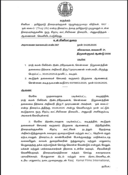 இந்நிலையில், நாளை ஒருநாள் மட்டும் தக் லைஃப் படத்தின் சிறப்பு காட்சிக்கு தமிழக அரசு அனுமதி வழங்கியுள்ளது. நாளை காலை 9 மணிக்கு சிறப்பு காட்சியாக தக் லைஃப் படத்தை கூடுதலாக திரையிட அனுமதி வழங்கப்பட்டுள்ளது.