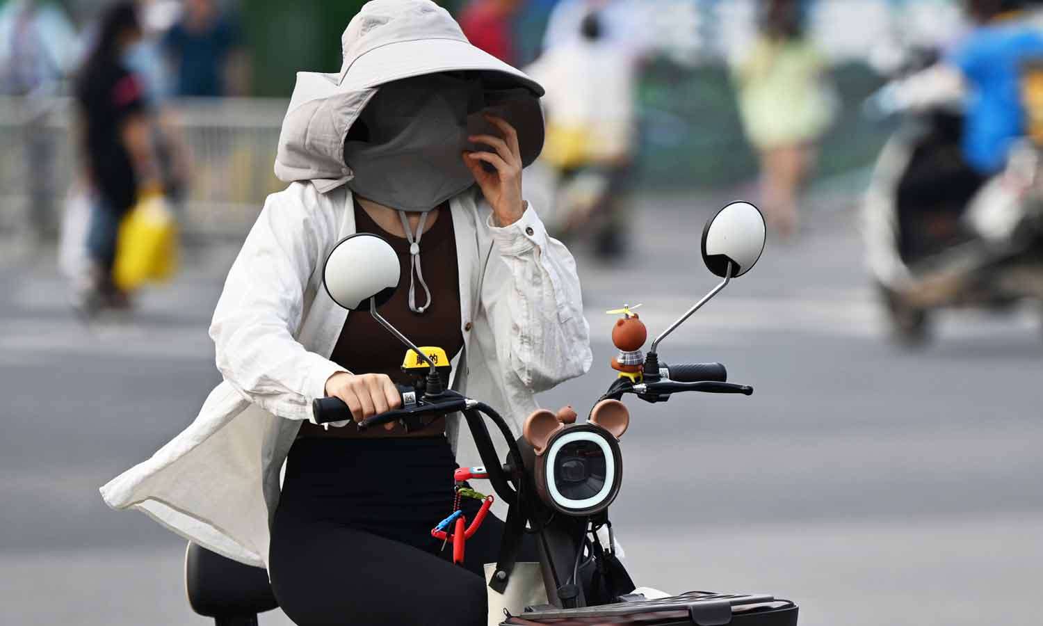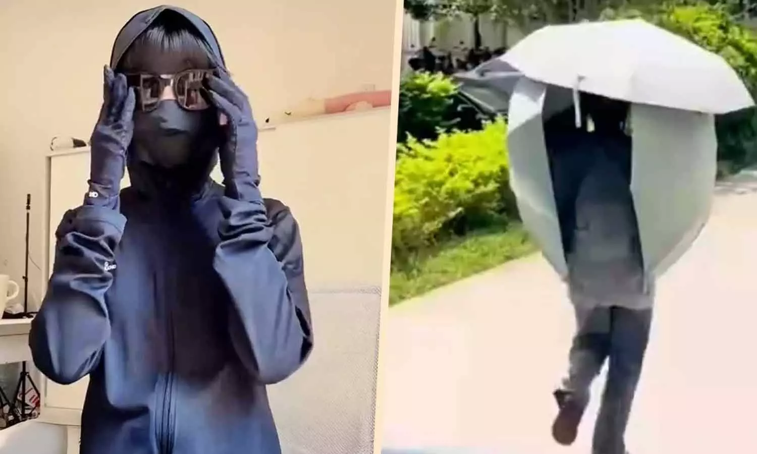 அதன்படி பெண்கள் அகன்ற விளிம்பு கொண்ட முகமூடிகள், சூரிய பாதுகாப்பு கையுறைகள், குளிர்விக்கும் முகமூடிகள் மற்றும் லேசான UV-எதிர்ப்பு ஹூடிகளைப் (தொப்பி வைத்த சட்டை) பயன்படுத்தி சூரிய ஒளியில் இருந்து தங்களை தற்காத்துக் கொள்கிறார்கள். அந்த வகையில் இந்த பெண்ணும் இதனை பின்பற்றி வந்துள்ளார்.