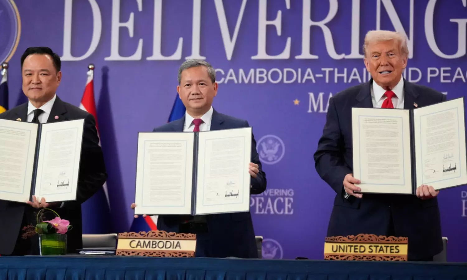 கம்போடிய பிரதமர் ஹுன் மானெட் மற்றும் தாய்லாந்து பிரதமர் அனுடின் சார்ன்விராகுல் ஆகியோர் டிரம்ப் முன்னிலையில் ஒப்பந்தத்தில் கையெழுத்திட்டனர்.