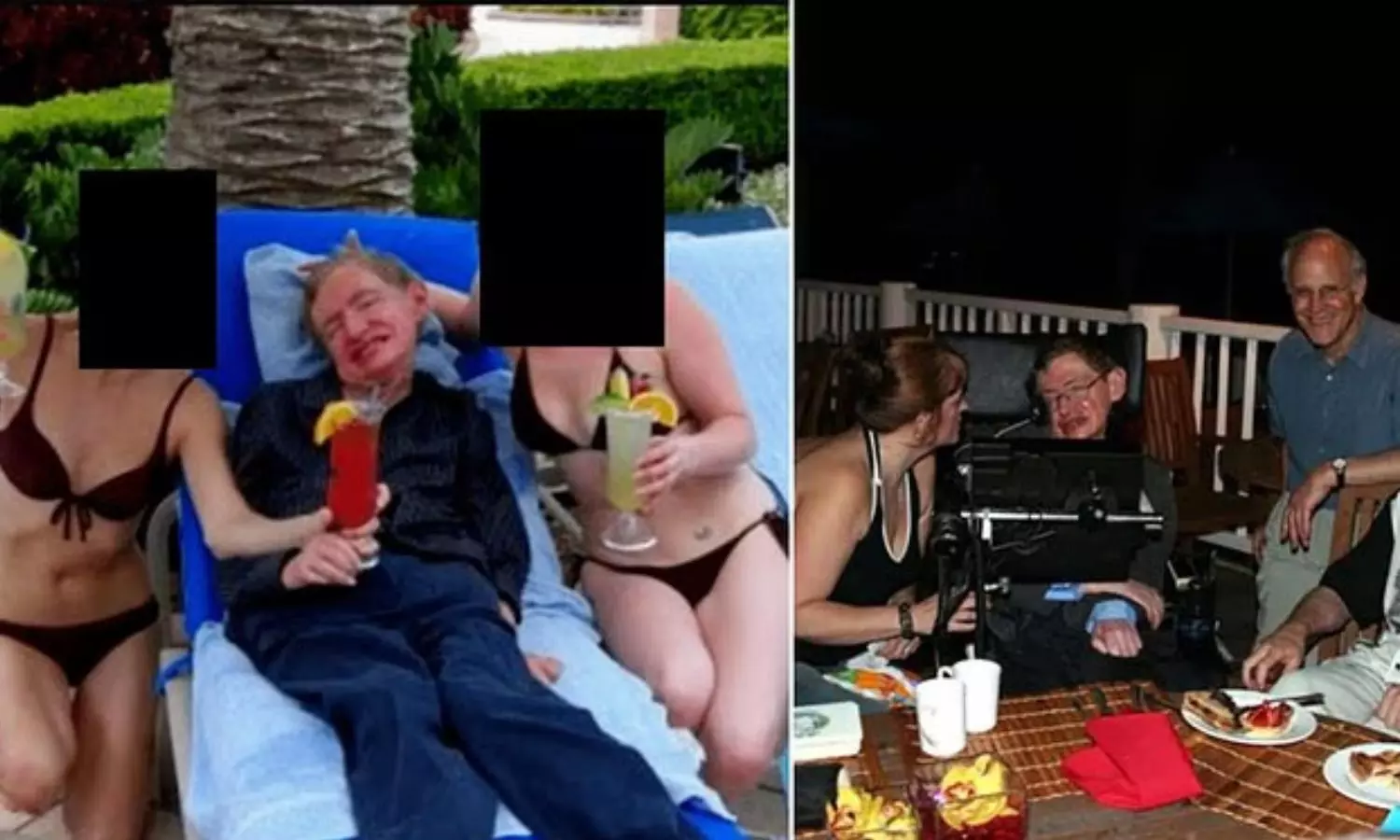எப்ஸ்டீன் கோப்புகளில் இருந்து வெளியிடப்பட்ட புகைப்படத்தில், ஹாக்கிங் ஒரு ஓய்வு நாற்காலியில் அமர்ந்திருப்பதும், அவருக்கு இருபுறமும் பிகினி அணிந்த இரண்டு பெண்கள் இருப்பதும் தெரிகிறது.