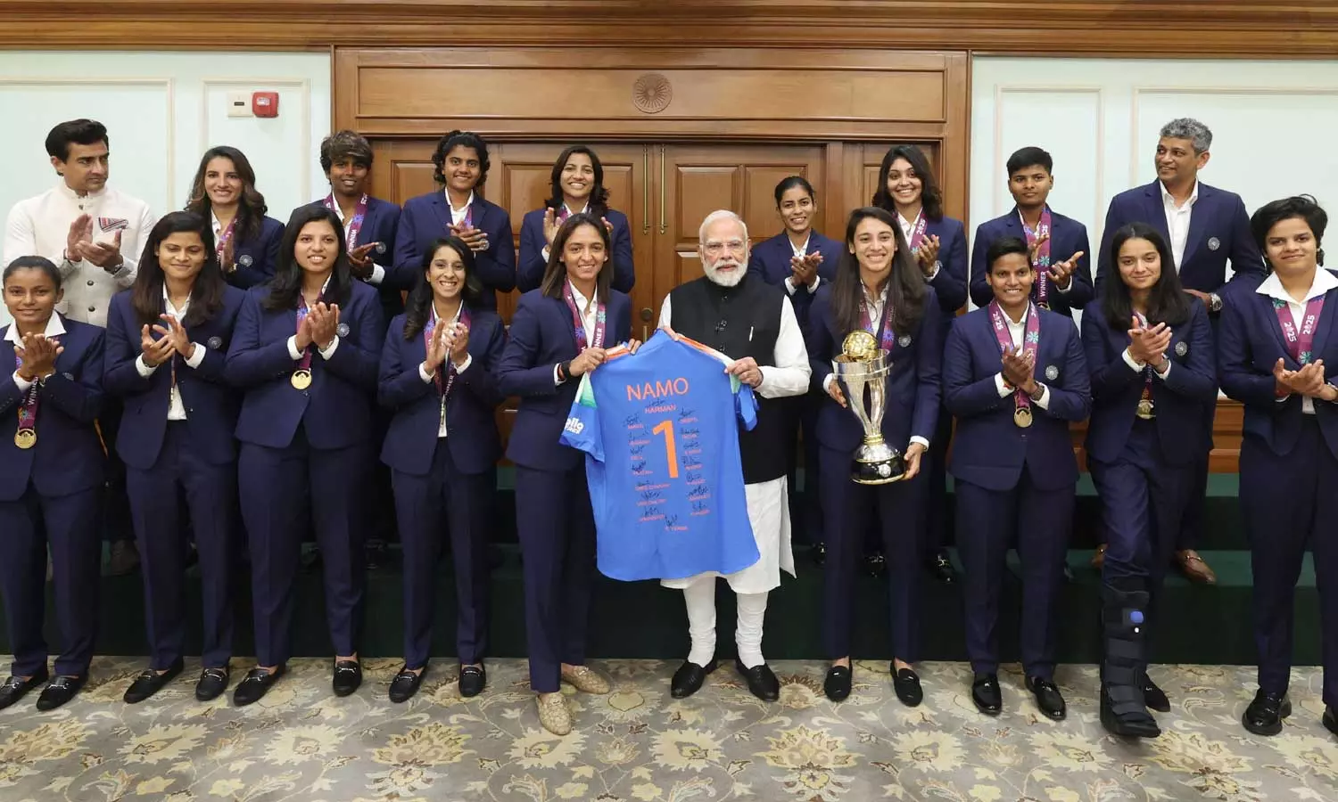 உலக கோப்பையை வென்ற இந்திய அணி வீராங்கனைகள், அணி நிர்வாகிகள் இன்று பிரதமர் மோடியை, அவரது லோக் கல்யாண் மார்க் வீட்டில் சந்தித்தனர். அப்போது வீராங்கனைகளுடன் பிரதமர் மோடி உரையாடினார். அப்போது பிரதமர் மோடியிடம் உலககோப்பையை வழங்கி போட்டோ எடுத்துக் கொண்டனர்.