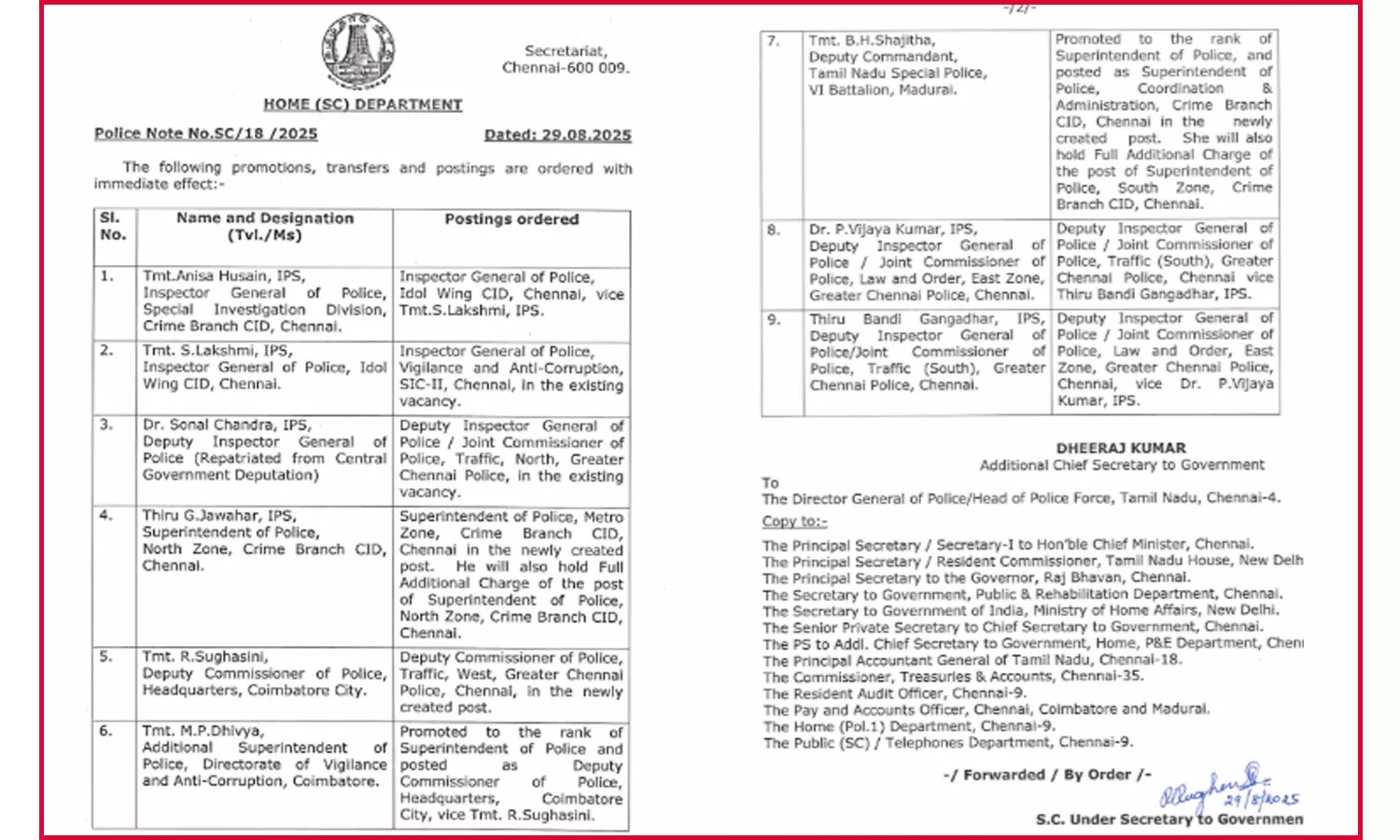 * கோவை காவல் தலைமையக துணை ஆணையராக திவ்யா, பதவி உயர்வு பெற்ற சஜிதா சென்னை சிபிசிஐடி எஸ்.பி.யாக நியமனம் செய்யப்பட்டுள்ளனர்.