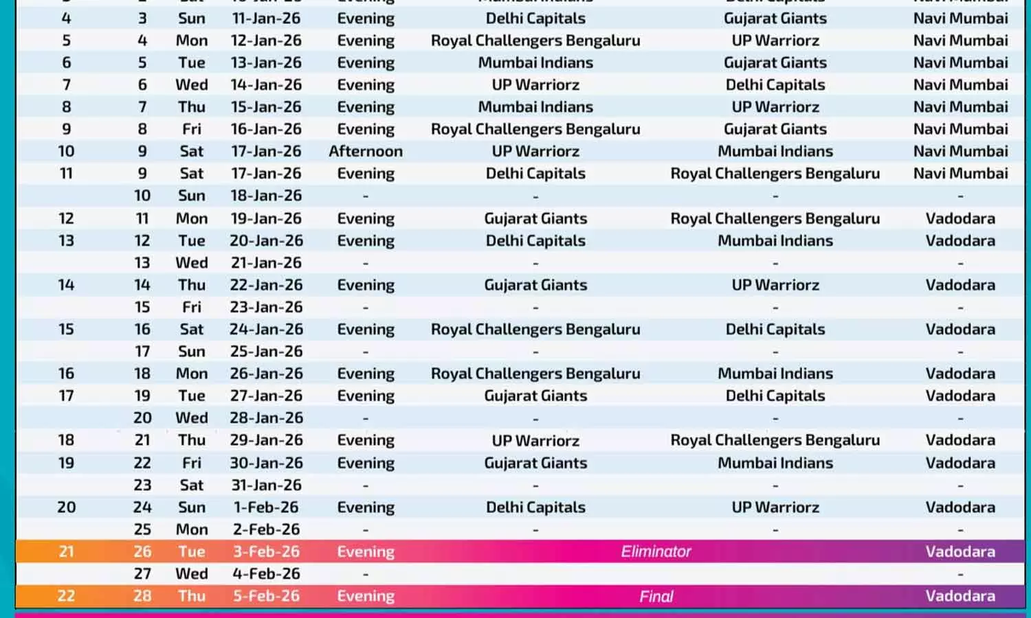 நவிமும்பை, வதோதரா ஆகிய 2 இடங்களில் போட்டி நடக்கிறது. எலிமினேட்டர் மற்றும் இறுதிப்போட்டி வதோதராவில் நடக்கிறது. 28 நாட்கள் நடைபெறும் இந்தப் போட்டி 22 ஆட்டங்களை கொண்டது.