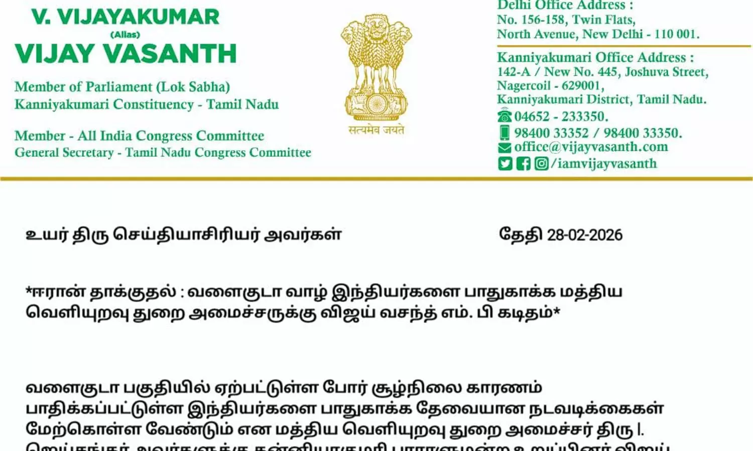 வளைகுடா பகுதியில் ஏற்பட்டுள்ள போர் சூழ்நிலை காரணமாக பாதிக்கப்பட்டுள்ள இந்தியர்களைப் பாதுகாக்கத் தேவையான நடவடிக்கைகள் மேற்கொள்ள வேண்டும் என மத்திய வெளியுறவுத்துறை மந்திரி ஜெய்சங்கருக்கு கன்னியாகுமரி எம்.பி. விஜய் வசந்த் கோரிக்கை வைத்துள்ளார்.