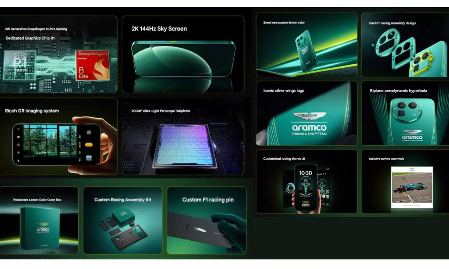இந்த ஸ்மார்ட்போன் ஆழமாக ரேசிங் தீம் யுஐ மற்றும் பிரத்யேக கேமரா வாட்டர்மார்க் ஆகியவற்றைக் கொண்டுள்ளது. மேலும், இதில் மெக்கானிக்கல் அசெம்ப்ளி டிசைன் கொண்ட பிரத்யேக லென்ஸ் மாட்யூல் கொண்டிருக்கிறது. மேலும், அணியின் நிறத்துடன் ஒற்றுப்போகும் வகையில் லெமன் கலர் தீமில் கிடைக்கிறது. இத்துடன் F1 அணியின் அதே சில்வர் விங் லோகோ பொருத்தப்பட்டுள்ளது.