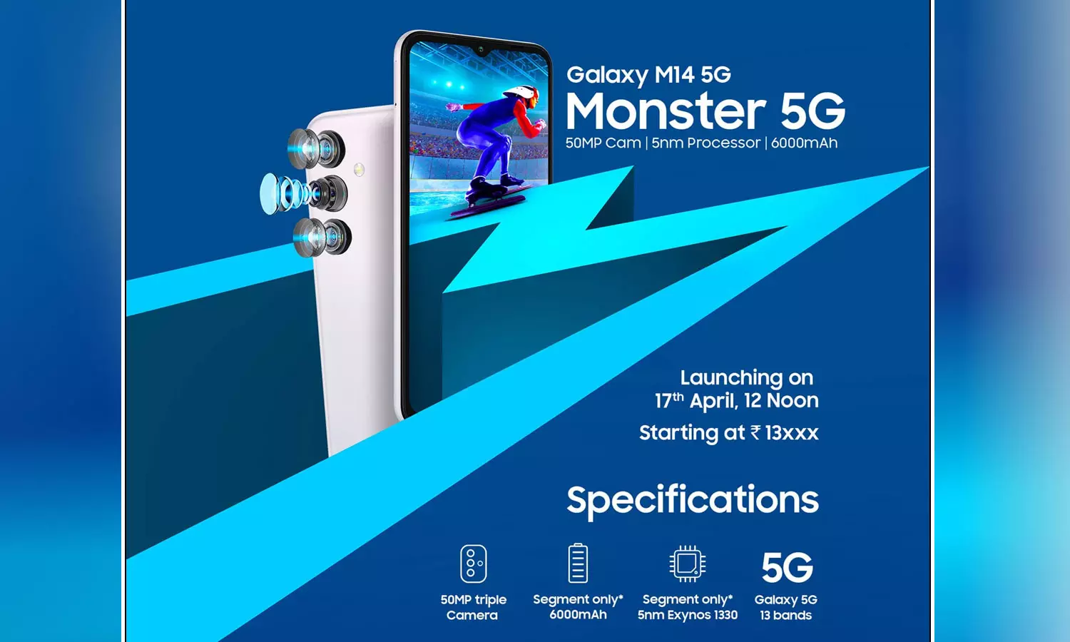 அமேசான் மைக்ரோசைட்டில் புதிய கேலக்ஸி M14 அம்சங்கள் பற்றிய தகவல் இடம்பெற்றுள்ளது. இந்திய சந்தையில் சாம்சங் கேலக்ஸி M14 ஸ்மார்ட்போன் ஏப்ரல் 17 ஆம் தேதி மதியம் 12 மணிக்கு அறிமுகம் செய்யப்பட இருக்கிறது. இந்த ஸ்மார்ட்போனில் அதிகபட்சம் 13 வித்தியாசமான 5ஜி பேண்ட்களை சப்போர்ட் செய்யும் வசதி வழங்கப்படுகிறது.