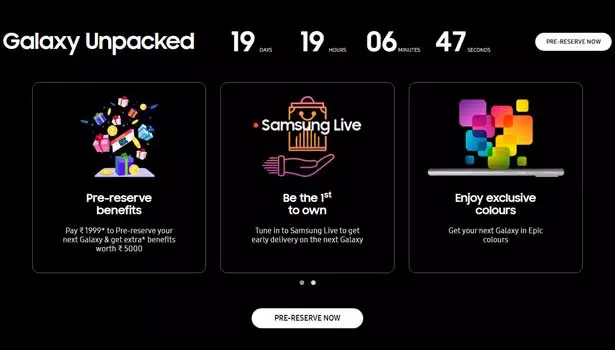 - சாம்சங் இந்தியா வலைதளத்தில் Pre Reserve பட்டனை க்ளிக் செய்ய கேலக்ஸி Pre Reserve VIP பாஸ் பெறவும்.