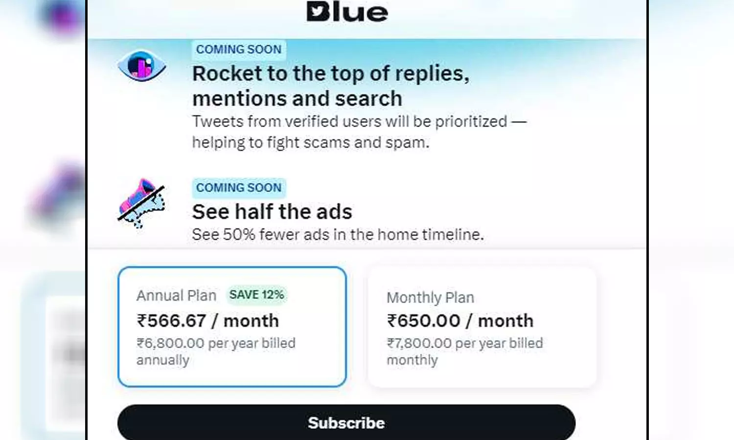 இந்திய பயனர்கள் இனி டுவிட்டர் புளூ சந்தாவில் இணைய முடியும். முன்னதாக தேர்வு செய்யப்பட்ட சில நாடுகளில் மட்டும் வழங்கப்பட்டு இருந்த டுவிட்டர் புளூ சந்தா தற்போது இந்தியாவிலும் வெளியிடப்பட்டு இருக்கிறது. டுவிட்டர் புளூ சந்தா பெறுவோருக்கு புளூ டிக் வழங்கப்பட்டு விடும். இந்தியாவில் டுவிட்டர் புளூ கட்டணம் வலைதளம் மற்றும் மொபைலில் மாதம் முறையே ரூ. 650 மற்றும் ரூ. 900 என நிர்ணயம் செய்யப்பட்டு உள்ளது.