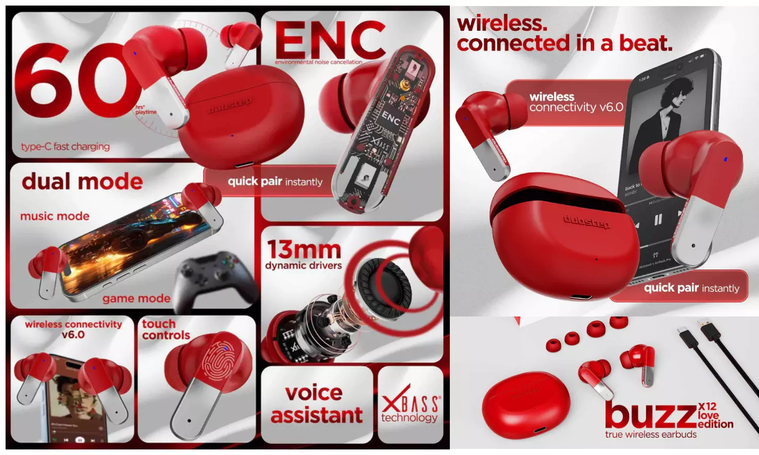 புதிய டப்-ஸ்டெப் X12 லவ் எடிஷன் இயர்பட்ஸ் கவர்ச்சிகரமான பேஷன்-ரெட் ஃபினிஷ் செய்யப்பட்டு மெட்டாலிக் அக்சென்ட்களால் அலங்கரிக்கப்பட்டுள்ளது. இதில் ப்ளூடூத் 5.4 கனெக்டிவிட்டி, X-Bass தொழில்நுட்பம் வழங்கப்பட்டு இருக்கிறது. இது மேம்பட்ட ஆடியோ மற்றும் என்விரான்மென்டல் நாய்ஸ் கேன்சலேஷன் (ENC) வசதியை வழங்குகிறது. இதில் உள்ள பேட்டரி 60 மணி நேர பிளேடைம் வழங்குகிறது.