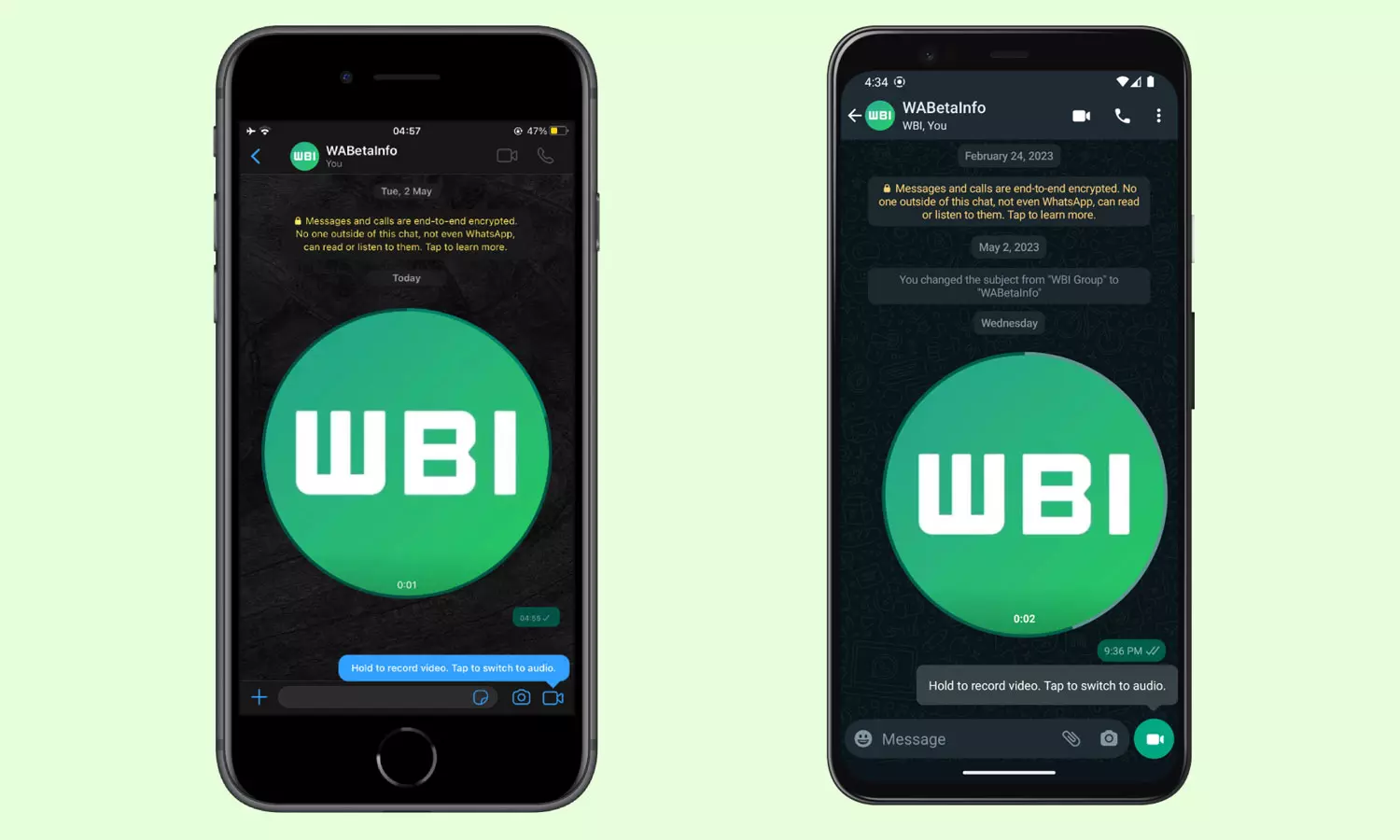 தற்போது வாட்ஸ்அப் ஐஒஎஸ் பீட்டா 23.12.0.71 வெர்ஷன், ஆண்ட்ராய்டு பீட்டா 2.23.13.4 வெர்ஷனில் புதிய வீடியோ மெசேஜ் அம்சம் டெஸ்டிங் செய்யப்பட்டு வருகிறது. ஆடியோ மெசேஜ் போன்றே புதிய வீடியோ மெசேஜ் அம்சத்தையும் எளிதில் இயக்க முடியும். ஒவ்வொரு சாட்களிலும் மைக்ரோபோன் இடம்பெற்றுள்ள பகுதியிலேயே வீடியோ ஐகான் இடம்பெறுகிறது. இதனை க்ளிக் செய்து ஆடியோ அல்லது வீடியோ மெசேஜ் அனுப்ப முடியும்.